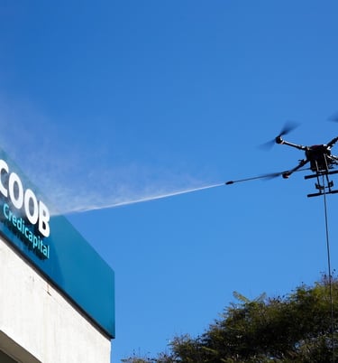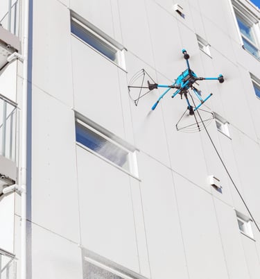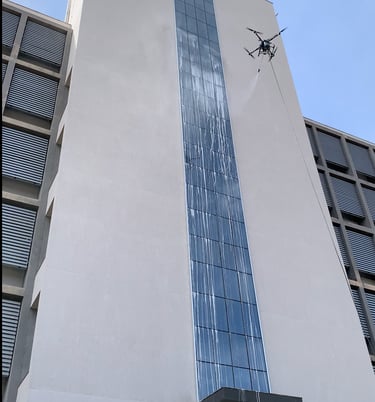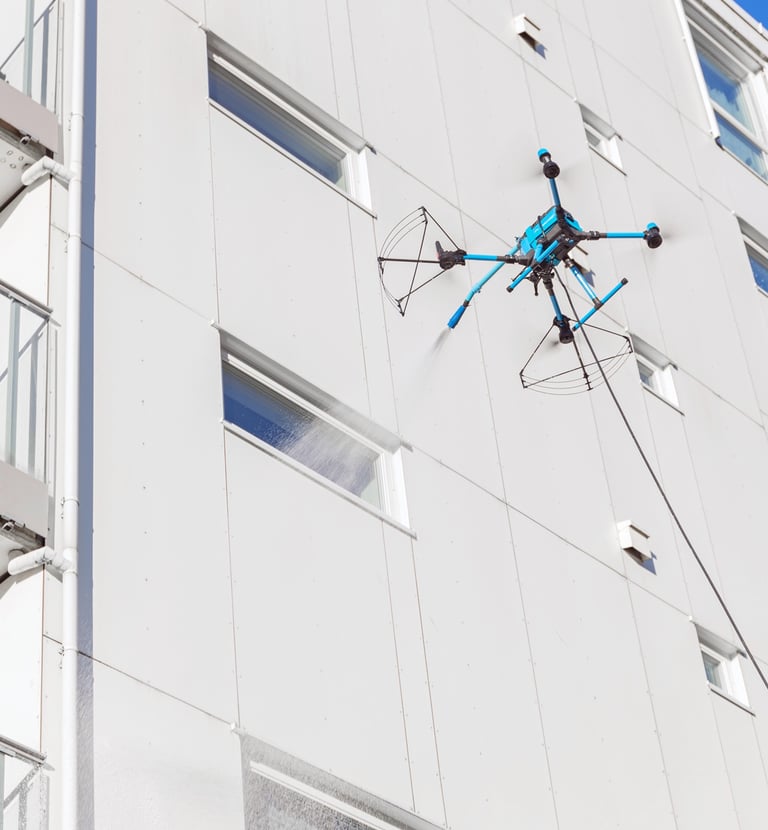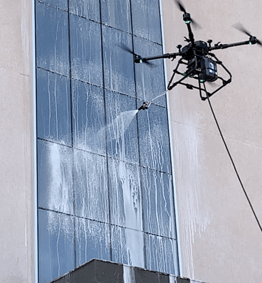 A limpeza de janelas comerciais de arranha-céus pode consumir muito tempo. m75 Drones desenvolveu uma nova maneira mais eficiente e segura de fornecer limpeza de janelas de arranha-céus, que também é considerada mais rápida, reduzindo assim os custos.